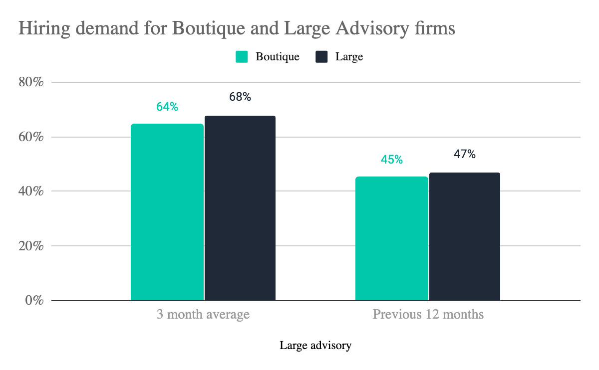 Despite the noise around disruption, our data shows a very different short-term story. Hiring demand across the advisory sector has been rising sharply compared to last year. Initially, we hypothesised that this growth was concentrated in boutique firms, smaller, more agile players pivoting to build AI-focused propositions. If true, this would suggest not a real increase in overall demand, but rather a talent migration away from large consulting firms into specialist boutiques.